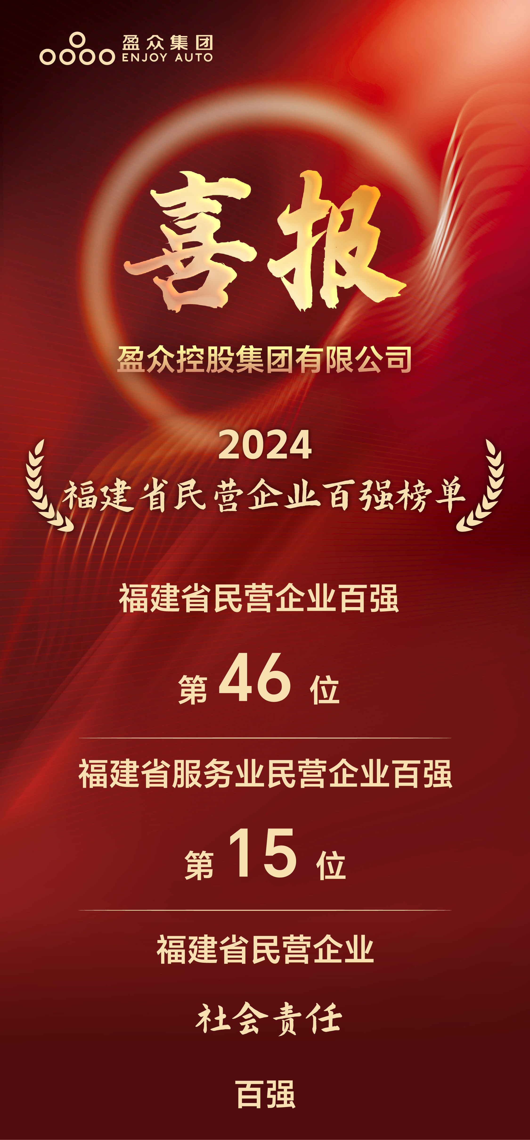 9月19日,福建省工商聯(lián)權威發(fā)布2024年度福建省民營企業(yè)百強榜單,包括2024福建省民營企業(yè)100強、服務業(yè)民營企業(yè)100強和福建省民營企業(yè)社會責任100佳。盈眾集團以優(yōu)異表現(xiàn)榮登榜單,位列福建省民營企業(yè)100強第46位,福建省服務業(yè)民營企業(yè)100強第15位,同時,盈眾控股集團還入圍“福建省民營企業(yè)社會責任100佳”。本次入圍多個榮譽榜單,是對盈眾控股集團在汽車銷售服務行業(yè)深耕細作、創(chuàng)新不止的高度認可。作為福建省規(guī)模領先的汽車經(jīng)銷商集團、福建省在中國汽車流通行業(yè)中的代表企業(yè),盈眾將不忘初心,專注汽車銷售服務行業(yè),堅持以客戶為中心,持續(xù)深化改革,緊跟時代發(fā)展,加快創(chuàng)新步伐,在為中國汽車消費市場發(fā)展持續(xù)貢獻力量的同時,也為廣大客戶提供更豐富、更具活力的美好車生活服務。