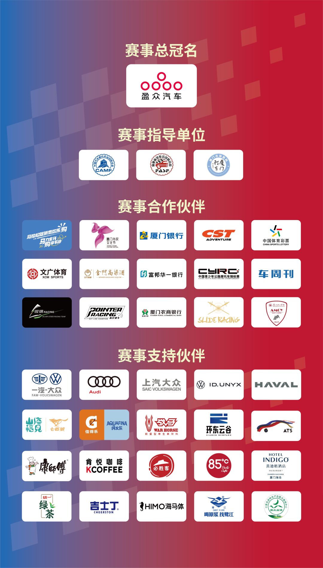 賽事由廈門(mén)市翔安區(qū)文化和旅游局、廈門(mén)市翔安區(qū)市場(chǎng)監(jiān)督管理局、廈門(mén)市翔安區(qū)婦女聯(lián)合會(huì)、廈門(mén)市翔安區(qū)內(nèi)厝鎮(zhèn)人民政府主辦;由中國(guó)汽車(chē)摩托車(chē)運(yùn)動(dòng)聯(lián)合會(huì)、福建省汽車(chē)運(yùn)動(dòng)聯(lián)合會(huì)、廈門(mén)市體育局、廈門(mén)市翔安區(qū)人民政府共同指導(dǎo);并得到了廈門(mén)文廣體育有限公司、廈門(mén)市翔安區(qū)文化館、廈門(mén)市翔安區(qū)青少年宮、指針賽車(chē)、銀驥賽車(chē)、中汽賽智(重慶)體育發(fā)展有限公司、廈門(mén)市翔安區(qū)吉他協(xié)會(huì)、廈門(mén)市翔安區(qū)音樂(lè)舞蹈協(xié)會(huì)、廈門(mén)市翔安區(qū)餐飲協(xié)會(huì)等單位和團(tuán)體的大力支持。